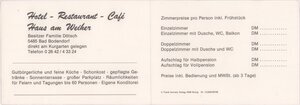 Quergefaltete Zimmerpreisliste für das Kurhotel. Auf der Vorderseite zwei Bild mit Außenansicht (Haus und Gästeterrasse) und zwei Bilder mit Inneransicht (Gastraum und Zimmer). Auf der zweiten Außenseite neun Fotos mit Kurgarten, Schwimmbad und Dorfansichten.