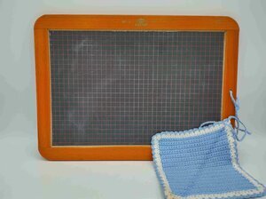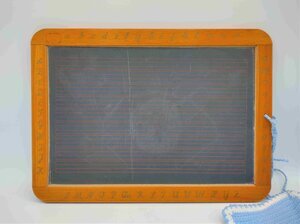 Die Schiefertafel besteht aus einer Schieferplatte, die von einem Holzrahmen eingefasst ist. In die Schiefertafel ist auf der einen Seite ein kariertes Muster und auf der anderen Seite Linien eingeritzt, so dass auf der einen Seite die Matheaufgaben und auf der anderen Seite die übrigen Aufgaben in der Schule bearbeitet werden konnten. Bei den Linien handelt es sich jedoch nicht um einfache Linien, sondern um die Art von Linierung, wie man sie heute auf Kieserblöcken findet, die in der ersten und zweiten Klasse verwendet werden. Am Holzrahmen ist ein gehäkeltes, blau-weißes Läppchen aus Baumwolle befestigt, in welchem zu diesem Zweck ein kleines Loch gebohrt ist. Des Weiteren ist der Rahmen zusammengesteckt und geleimt und er besitzt verschiedene Prägungen. Auf der Seite mit den Linien ist in den Rahmen das Alphabet in Schreibschrift, einmal in Großbuchstaben und einmal in Kleinbuchstaben eingeprägt. Die Seite mit dem karierten Muster besitzt die Prägung des Herstellers: N°5 Krone R1.