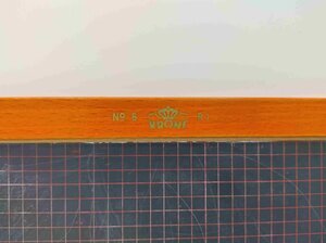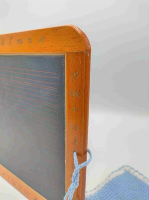 Die Schiefertafel besteht aus einer Schieferplatte, die von einem Holzrahmen eingefasst ist. In die Schiefertafel ist auf der einen Seite ein kariertes Muster und auf der anderen Seite Linien eingeritzt, so dass auf der einen Seite die Matheaufgaben und auf der anderen Seite die übrigen Aufgaben in der Schule bearbeitet werden konnten. Bei den Linien handelt es sich jedoch nicht um einfache Linien, sondern um die Art von Linierung, wie man sie heute auf Kieserblöcken findet, die in der ersten und zweiten Klasse verwendet werden. Am Holzrahmen ist ein gehäkeltes, blau-weißes Läppchen aus Baumwolle befestigt, in welchem zu diesem Zweck ein kleines Loch gebohrt ist. Des Weiteren ist der Rahmen zusammengesteckt und geleimt und er besitzt verschiedene Prägungen. Auf der Seite mit den Linien ist in den Rahmen das Alphabet in Schreibschrift, einmal in Großbuchstaben und einmal in Kleinbuchstaben eingeprägt. Die Seite mit dem karierten Muster besitzt die Prägung des Herstellers: N°5 Krone R1.