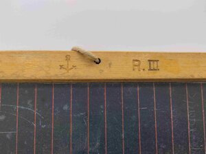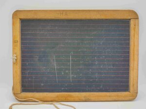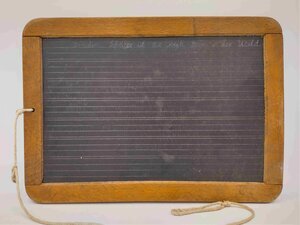 Die Schiefertafel besteht aus einer Schieferplatte, die von einem Holzrahmen eingefasst ist. In die Schiefertafel ist auf der einen Seite ein kariertes Muster und auf der anderen Seite einfache Linien eingeritzt, so dass auf der einen Seite die Matheaufgaben und auf der anderen Seite die übrigen Aufgaben in der Schule bearbeitet werden konnten. In den Holzrahmen ist ein kleines Loch gebohrt, damit dort ein Läppchen befestigt werden konnte. Bei dieser Tafel ist jedoch nur noch die Schnur des Läppchens vorhanden, das Läppchen selbst fehlt. Der Holzrahmen ist zusammengesteckt und geleimt und auf der Seite mit der linierten Einritzung sind am oberen Rand die Buchstaben H und A eingeritzt (vermutlich vom Vorbesitzer, evtl. Initialen) und neben dem Loch zum Befestigen der Läppchen ist links ein Anker eingeprägt und rechts ein R und III (römische 3).