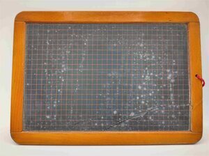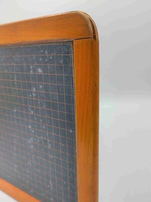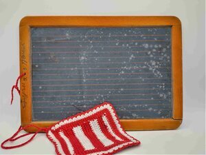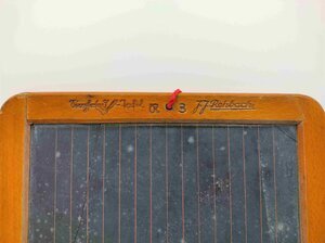 Die Schiefertafel besteht aus einer Schieferplatte, die von einem Holzrahmen eingefasst ist. In die Schiefertafel ist auf der einen Seite ein kariertes Muster und auf der anderen Seite einfache Linien eingeritzt, so dass auf der einen Seite die Matheaufgaben und auf der anderen Seite die übrigen Aufgaben in der Schule bearbeitet werden konnten. Am Holzrahmen ist ein gehäkeltes, rot-weiß gestreiftes Läppchen befestigt, in welchem zu diesem Zweck ein kleines Loch gebohrt ist. Durch die Tafel ziehen sich auf Vorder- und Rückseite Risse, auf der Seite mit der karierten Einritzung ist auf der Oberfläche auch etwas Schiefer weggebrochen. Der Holzrahmen ist zusammengesteckt und geleimt und auf der Seite mit der linierten Einritzung ist um das Löchlein herum eine Prägung vorhanden. Dort steht in Sütterlin geschrieben "Siegfried - Iafel" (das zweite Wort ist nicht so gut zu erkennen), gefolgt von Schreibschrift "R 3 J.J. Rehbach". Siegfried war eventuell der Vorname des Besitzers und er hat seinen Namen eigenständig in die Tafel eingeritzt.