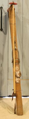 Kinderski aus Eschenholz mit Kabelzugbindung. Die Bindung besitzt links und rechts am Ski nur einen, allerdings aussergewöhnlich langen Unterzug. Stöcke aus Bambus mit Lederschlauf, Metallspitze und später hinzugefügten roten Kunststofftellern.