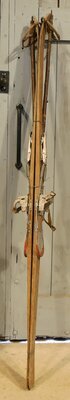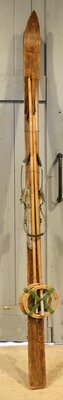 Kinderski aus Eschenholz mit Kabelzugbindung. Die Bindung besitzt links und rechts je zwei Unterzüge. Stöcke aus Holz (Hasel?) mit Lederschlaufe, Teller aus hölzernem Ring und Leder. Eiserne Stockspize. Keine Herstellerangaben erkennbar. Die Bindung ist insoweit uneinheitlich, da die Schuhe des Skifahrers auch mittels einer Lederschlaufe auf dem Ski gehalten wurden, was auf die Zeit vor dem Zweiten Weltkrieg hindeutet, der Spanner und das Spannseil aber eher auf die 1960er-Jahre zu datieren sind.