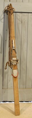 Kinderski aus Eschenholz mit Kabelzugbindung. Die Bindung besitzt links und rechts je zwei Unterzüge. Stöcke aus Holz (Hasel?) mit Lederschlaufe, Teller aus hölzernem Ring und Leder. Eiserne Stockspize. Keine Herstellerangaben erkennbar. Die Bindung ist insoweit uneinheitlich, da die Schuhe des Skifahrers auch mittels einer Lederschlaufe auf dem Ski gehalten wurden, was auf die Zeit vor dem Zweiten Weltkrieg hindeutet, der Spanner und das Spannseil aber eher auf die 1960er-Jahre zu datieren sind.