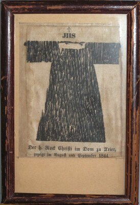 Kleines Andachtsbild, das den an einer Stange hängenden heiligen Rock zeigt. Über dem schwarzen heiligen Rock stehen die Buchstaben "JHS" - Jesum Habemus Socium - Wir haben in Jesus einen Gefährten. Darüber wiederum befindet sich ein kleines stilisiertes Kreuz. Unter dem heiligen Rock steht die Inschrift "Der h. Rock Christi im Dom zu Trier, gezeigt im August und September 1844". Die Wallfahrt 1844 geriet in ein politisches Spannungsfeld zwischen dem protestantischen Preußen und dem rheinischen Katholizismus einerseits und der Demokratiebewegung des Vormärz andererseits. Die preußische Regierung in Berlin wollte z. B. durchsetzen, dass Brautleute mit verschiedenen Religionszugehörigkeiten heiraten durften und deren Kinder nicht automatisch katholisch erzogen werden mussten. Insbesondere der Kölner Bischof von Droste-Vischering vertrat diese Position gegenüber Preußen so vehement, dass er aus dem Amt entlassen wurde. In die besondere Kritik der Vertreter des Vormärz geraten war die Reliquienverehrung und das Wallfahrtswesen der katholischen Kirche. Ihr stärkster Vertreter war der suspendierte katholische Priester Johannes Ronge (1813-1887), der scharf gegen die Zeigung des heiligen Rocks 1844 wetterte und in eine direkte Auseinandersetzung mit dem Trierer Bischof Wilhelm Arnoldi (1842-1864) geriet. Ronges Kritik an der katholischen Kirche wie die anderer Vertreter des Vormärz ging jedoch weit über die Heilig-Rock-Wallfahrt hinaus und richtete sich gegen die Wiedererstarkung des Katholizismus. Trotz aller Differenzen und Spannungen besuchten 500 000 Gläubige den heiligen Rock im Trierer Dom - was als eine Machtdemonstration des Katholizismus angesehen wurde. Das Andenkenbild ist in einem Passepartout aus beigem Karton in einem kleinen Bilderrahmen aus Holz überliefert. Der Rücken ist aus einem starkem Karton mit aufklappbarem Aufsteller gefertigt, hat aber auch einen kleinen Metallring zum Aufhängen an die Wand.