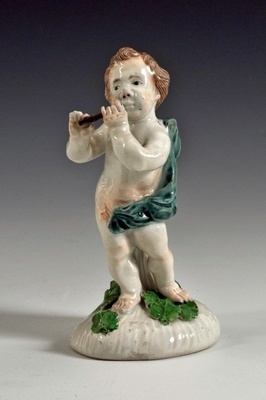 Putto mit Flöte Höchster Porzellanmanufaktur 1750-1753 Bezeichnung unter dem Boden: eisenrote Signatur "B", Preßmarken "B" u. "22"
