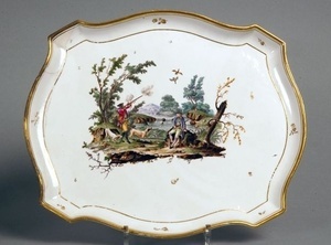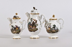 Ein Solitaire ist ein Frühstücksservice, das ist ein Satz zusammengehörender Geschirrteile mit einheitlicher Form und gleichem Muster (Dekor). Wie der Name erkennen lässt, ist ein Solitaire für eine Person gedacht. Es besteht aus: -) einem Serviertablett -) einer kleinen Teekanne und einer Kaffeekanne -) einem Milch- oder Sahnegießer -) einer Zuckerdose -) einer Tasse mit Untertasse Frühstücksgeschirre wurden an den Adelshöfen nicht nur zum Lever oder Frühstück benutzt, sondern auch bei Zwischenmahlzeiten, die in privaten Räumen eingenommen wurden. Dieses Solitaire wurde von Johann Peter Melchior entworfen, dem damaligen Modellmeister der Höchster Porzellanmanufaktur. Tablettmaße: H: 3,2 cm, B: 36,0 cm, T: 30,0 cm Bezeichnung unter dem Boden: blaue Radmarke