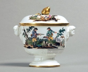 Ein Solitaire ist ein Frühstücksservice, das ist ein Satz zusammengehörender Geschirrteile mit einheitlicher Form und gleichem Muster (Dekor). Wie der Name erkennen lässt, ist ein Solitaire für eine Person gedacht. Es besteht aus: -) einem Serviertablett -) einer kleinen Teekanne und einer Kaffeekanne -) einem Milch- oder Sahnegießer -) einer Zuckerdose -) einer Tasse mit Untertasse Frühstücksgeschirre wurden an den Adelshöfen nicht nur zum Lever oder Frühstück benutzt, sondern auch bei Zwischenmahlzeiten, die in privaten Räumen eingenommen wurden. Dieses Solitaire wurde von Johann Peter Melchior entworfen, dem damaligen Modellmeister der Höchster Porzellanmanufaktur. Tablettmaße: H: 3,2 cm, B: 36,0 cm, T: 30,0 cm Bezeichnung unter dem Boden: blaue Radmarke