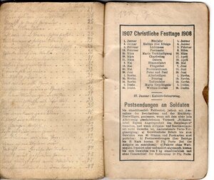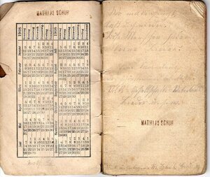 Ein handgeschriebenes Liederbuch von Mathias Schuh aus dem Jahr 1907. Es ist eine Sammlung schöner Volks-,Gesellschafts- und Wanderlieder. Klein und eng in Sütterlin geschrieben. Dazu noch mit Bleistift, was das lesen sehr erschwert. Am Ende des Notizbuches hat er ein Inhaltsverzeichnis eingefügt. Demnach wurden 53 Liedertexte aufgeschriebenen Texte.