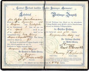Der Centralverband deutscher Bäcker-Innungen "Germania" hat dem am 27.12.1887 geborenem Oskar Brinkmann einen Lehrbrief, zum Erlernen des Bäckerhandwerks, am 20. März 1902 ausgestellt. Erlernt hat er den Beruf beim Bäckermeister Fritz König aus Heepen/Bielefeld. Zum Abschluss der Lehre bekam er am 20. März 1905 den Gesellenbrief ausgehändigt. Darin wird dem Prüfling in Führung und Leistung die Note GUT bescheinigt. Beide Dokumente sind im Innern eines schwarzen, aufklappbaren Umschlags eingeklebt. Die Vorderseite des Umschlags trägt die goldene Aufschrift: "Germania Lehr Brief" darunter das goldene Siegel der Bäckerinnung. Für das Prüfungszeugnis wurde ein Doppel ausgestellt, das ebenfalls vorhanden ist.