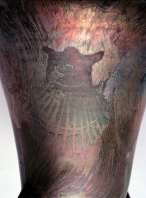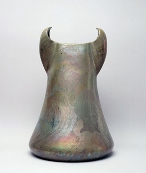 Diese Vase ist ein schillerndes Beispiel für die nicht nur auf Gläsern beliebten irisierenden Oberflächen. Clément Massier übernimmt um 1883 die väterliche Fayence-Manufaktur. Er experimentiert erfolgreich mit neuen Techniken von Lüsterglasuren, ähnlich den Glaskünstlern Copillet oder Caranza in Frankreich, der Glashütte Löetz Wwe in Böhmen oder Tiffany in USA. Auf der Weltausstellung 1889 erhält Massier die Goldmedaille für seine Lüsterware. Die Vase zeigt maritime Motive: Meereswellen und Muscheln sind deutlich zu erkennen. Auf der Unterseite ist sie mit einem Prägestempel bezeichnet: Clement Massier Golfe Juan AM. Zusätzlich wurde mit Glasurfarbe und Pinsel aufgetragen: MCM Golfe-JUAN HM 1900. Bezeichnung unter dem Boden: (Firmenstempel:) CLEMENT MASSIER GOLFE JUAN (AM) (in Glasurfarbe:) MCM Golfe-JUAN HM 1900