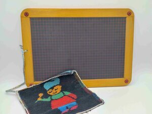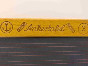 Die Schiefertafel besteht aus einer Schieferplatte, die von einem Holzrahmen eingefasst ist. In die Schiefertafel ist auf der einen Seite ein kariertes Muster und auf der anderen Seite Linien eingeritzt, so dass auf der einen Seite die Matheaufgaben und auf der anderen Seite die übrigen Aufgaben in der Schule bearbeitet werden konnten. Bei den Linien handelt es sich jedoch nicht um einfache Linien, sondern um die Lineatur 3. Diese Lineatur wird heute noch in den dritten Klassen verwendet, dabei besteht die "Schreibzeile" aus zwei Linien, welche 3,5mm auseinander sind und einen Abstand von 8mm zur nächsten Reihe haben. Durch die Tafel ziehen sich beidseitig kaum sichtbare Risse, die jedoch gut ertastet werden können. Am Holzrahmen ist ein buntes Läppchen befestigt, welches in seiner Machart an einen Waschlappen erinnert. Es ist mit Wolle umhäkelt und der gehäkelte Faden ist gleichzeitig die Schnur, die den Lappen am Rahmen befestigt. Dort ist zu diesem Zweck ein kleines Loch gebohrt ist. Der Rahmen ist zusammengesteckt und und mit Dübeln aus Kunststoff verstärkt, des Weiteren besitzt er die Prägung des Herstellers "Ankertafel - seit 1862" Neben der Marke ist auch ein umkreister Anker und eine umkreiste 3 in den Rahmen geprägt. Als Zusatz ist auch der Tafelschoner vorhanden. Auf dessen Vorderseite ist das Alphabet in lateinischer Ausgangsschrift (auch als Schreibschrift bekannt) in Groß- und Kleinbuchstaben abgebildet und auf der Rückseite findet sich eine Abbildung aus dem Märchen Schneewittchen. Das Bild mit der Märchendarstellung ist an der rechten und linken Seite durch das Alphabet in Großbuchstaben der Druckschrift eingefasst.