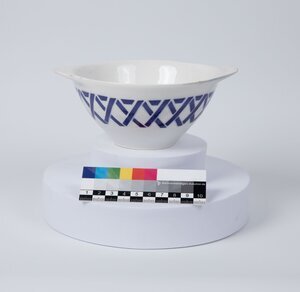 Opakes Glas, außen partiell mit blauem, darüber farblosem und dann wieder blauem Überfang; Dekor erhaben auf geätztem Grund, Deteils geschnitten. Bezeichnung unter dem Boden: Muller Croismare