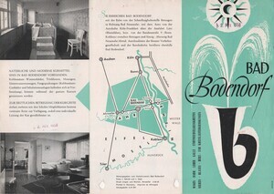 Vierseitiger Flyer 210 x 210 mm halbgefaltet auf rosafarbenem Papier. Vorderseite zeigt eine sprudelnde Quelle (vermutlich Ahrquell) und die Rückseite die Zeichnung einer Flasche Bodendorfer Thermalsprudel und ein Glas. Im Innenteil sind Gasthäuser und Privatpensionen mit den Preisen aufgelistet
