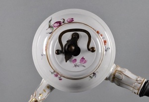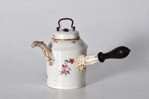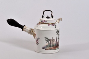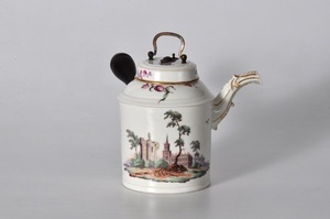 Schokoladenkanne mit Landschaft Höchster Porzellanmanufaktur um 1755 Bezeichnung unter dem Boden: goldene Radmarke und "C", Preßmarke "N I"