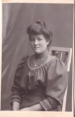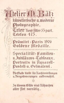 Zu sehen ist eine Frau mittleren Alters im Fotoatelier. Sie sitzt auf einem einfachen Holzstuhl und trägt eine, am Kragen und am Ende der Ärmel, verzierte Bluse. Die Haare sind nach allen Seiten hochgebunden, und in der Mitte zu einer Art Dutt zusammengesteckt. Auf der Rückseite sind Name und Sitz des Fotoateliers vermerkt.