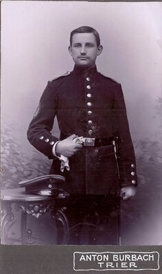 Zu sehen ist ein Soldat, der sich im Atelier in Pose gestellt hat. Seine Mütze liegt euf einem kleinen Tischchen, die rechte Hand umfasst den Gürtel. Auf dem rechten Arm ist das Kaiserabzeichen zu erkennen. Dieses Abzeichen wurde 1895 durch Kaiser Wilhelm II. als jährliches Preisschießen gestiftet, um die Schießleistungen zu verbessern. Das Abzeichen wurde zwischen 1895 und 1913 verliehen. Das Bild wurde auf ein Stück Pappe geklebt. Unter dem Foto und auf der Rückseite befindet sich Werbung des Fotoateliers.