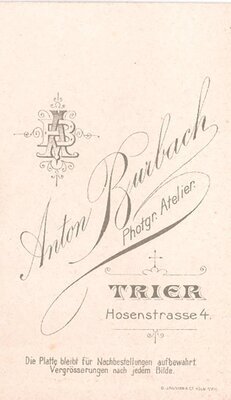 Zu sehen ist ein Soldat des 10. Rheinischen Infanterieregiments 161. Dieses Regiment war in Trier stationiert. Es handelt sich um ein Schwarzweißfoto, welches nachträglich pper Hand Koloriert wurde. Unter den Achselklappen befinden sich sogenannte "Schwalbennester", welche ihn als Musiker kennzeichnen. Das Foto ist mit mehreren Patriotischen Symbolen geschmückt. Das Bild wurde auf ein Stück Pappe geklebt. Unter dem Foto und auf der Rückseite befindet sich Werbung des Fotoateliers.