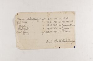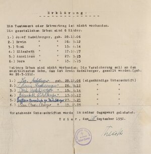 In dieser Erklärung aus dem Jahr 1950 ist festgehalten, dass kein Testament oder Erbvertrag existiert und es sich bei den Erben um die sechs Kinder der Familie Redelberger handelt. Um wenn es sich bei dem verstorbenen handelt steht nirgendwo, man kann jedoch davon ausgehen dass es sich um ein Elternteil der genannten Kinder handelt. Ausgestellt wurde die Erklärung am 28. September 1950 vom Pfarramt in Trier-Euren. Der Erklärung liegt zudem ein handgeschriebener Zettel mit weiteren Namen aus der Familie bei.