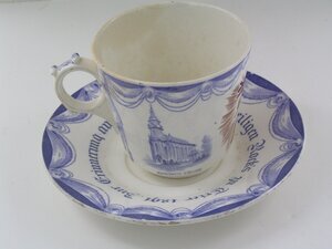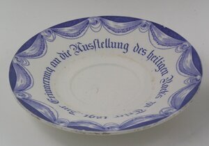 Im Umdruckverfahren verzierte Tasse mit Untertasse von der Ausstellung des heiligen Rocks in Trier 1891. Die konisch geformte Tasse zeigt drei Motive: das zentrale Bild in brauner Farbe zeigt den heiligen Rock, darüber ein geflügelter Engelskopf und ein Kreuz. Das Motiv ist von einem Strahlenkranz umgeben, unten steht "Trier 1891". Die Ansichten rechts und links zeigen in blauer Farbe den Trierer Dom und die Paulinus-Kirche, beide sind auf der Tasse bezeichnet. Oben sowie rechts und links rahmen blaue Volants die Bildmotive ein. Die Außenseite des Henkels zieren blaue stilisierte Blattranken. Die Untertasse trägt die Inschrift "Zur Erinnerung an die Ausstellung des heiligen Rock's zu Trier 1891". Volants in blauer Farbe umrahmen die Inschrift. Die Tasse mit Untertasse wurde von V