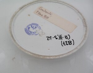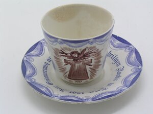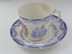 Im Umdruckverfahren verzierte Tasse mit Untertasse von der Ausstellung des heiligen Rocks in Trier 1891. Die konisch geformte Tasse zeigt drei Motive: das zentrale Bild in brauner Farbe zeigt den heiligen Rock, darüber ein geflügelter Engelskopf und ein Kreuz. Das Motiv ist von einem Strahlenkranz umgeben, unten steht "Trier 1891". Die Ansichten rechts und links zeigen in blauer Farbe den Trierer Dom und die Paulinus-Kirche, beide sind auf der Tasse bezeichnet. Oben sowie rechts und links rahmen blaue Volants die Bildmotive ein. Die Außenseite des Henkels zieren blaue stilisierte Blattranken. Die Untertasse trägt die Inschrift "Zur Erinnerung an die Ausstellung des heiligen Rock's zu Trier 1891". Volants in blauer Farbe umrahmen die Inschrift. Die Tasse mit Untertasse wurde von V