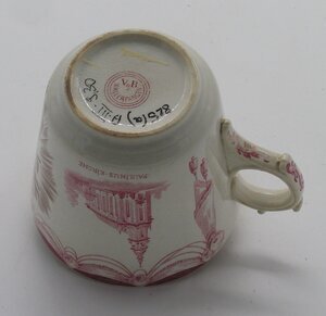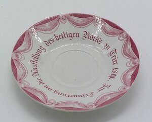 Im Umdruckverfahren verzierte Tasse und eine Untertasse von der Ausstellung des heiligen Rocks in Trier 1891. Die konisch geformte Tasse zeigt drei Motive: das zentrale Motiv in brauner Farbe zeigt den heiligen Rock, darüber ein geflügelter Engelskopf und ein Kreuz. Das Motiv ist von einem Strahlenkranz umgeben, unten steht "Trier 1891" Die Ansichten rechts und links zeigen den Dom und die Paulinus-Kirche, beide sind auf der Tasse bezeichnet. Oben sowie rechts und links rahmen Volants in roter Farbe die Bildmotive ein. Die Außenseite des Henkels zieren stilisierte Blattranken in roter Farbe. Die Untertasse trägt die Inschrift "Zum Andenken an die Ausstellung des heiligen Rock's zu Trier 1891." Volants in roter Farbe umrahmen die Inschrift. Hergestellt wurden die Tasse und die Untertasse von Villeroy & Boch in Wallerfangen.