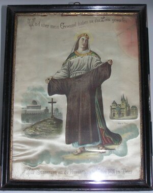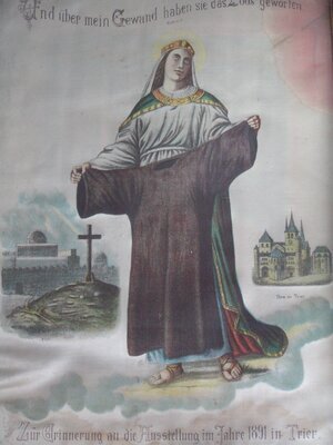 Großformatiges, auf Seide gedrucktes farbiges Andenkenbild, das die heilige Helena zeigt, die den heiligen Rock hält. Sie ist in ein prächtiges Gewand gekleidet und ihr Haupt ist von einem Heiligenschein umgeben. Sie schwebt auf einer von Wolken umgebenen Grasfläche. Links von ihr ist der Berg Golgotha mit dem Kreuz abgebildet und die Grabeskirche. Rechts ist der Trierer Dom abgebildet, in dem die Reliquie aufbewahrt wird. Über der heiligen Helena steht der Spruch aus dem Matthäusevangelium Kapitel 27 Vers 32: "Und über mein Gewand haben sie das Loos geworfen." Zu ihren Füßen steht die Inschrift "Zur Erinnerung an die Ausstellung im Jahre 1891 in Trier." Das Andenkenbild ist einem schwarz lackierten Holzrahmen mit einer goldfarbenen Innenkante aus der Entstehungszeit des Andenkenbildes hinter Glas gerahmt. Helena, geboren um 255, war die Mutter des römischen Kaisers Konstantin des Großen (gestorben 337). Konstantin hatte 312 vor der Schlacht um Rom einen Traum, der ihm sagte, dass er im Zeichen Christi diese Schlacht gewinnen würde. Daraufhin bekannte er sich zum Christentum und überzeugte auch seine Mutter Helena. Nach ihrer Bekehrung zum christlichen Glauben unternahm sie um 324 unternahm eine Pilgerreise ins heilige Land und besuchte die heiligen Stätten: u. a. den Berg Golgotha, wo Jesus gekreuzigt wurde, und die Grabeskirche. Sie entdeckte im heiligen Land viele Reliquien, darunter den aus einem Stück gewebten Rock Jesu, den er auf dem Weg zum Kreuz trug; weiterhin das Kreuz von Jesu, das sie an einer Wunderheilung erkannte, und die Gebeine des Apostel Matthias. Der Legende nach brachte sie den heiligen Rock und die Gebeine des Apostels Matthias nach Trier, wo sie heute im Trierer Dom bzw. im Kloster St. Matthias noch aufbewahrt werden. Die älteste schriftliche Überlieferung über den heiligen Rock in Trier stammt aus dem 11. Jh. In einem Reliquienschrein, der über eine lange Zeit nicht geöffnet wurde, sollten sich die Gewänder und Schuhe von Jesus befinden, die er vor seinem Tod am Kreuze getragen haben sollte. Als nun der Schrein erstmalig durch einen Eremiten wieder geöffnet wurde, erblindete er schlagartig beim Anblick der Reliquien. Daraus leitete sich ab, dass sie niemand mehr anschauen sollte. Erst 1512 wurde der Schrein bei einem Besuch des Kaisers Maximilian (1493-1519) in Trier nochmals geöffnet. Die Bevölkerung von Trier drängte darauf, den heiligen Rock auch sehen zu dürfen, dem der Erzbischof Richard von Greiffenklau zu Vollrads (1511-1531) nachgab. Erst durften die Trierer Gläubigen nur den gefalteten heiligen Rock sehen, sie drängten aber weiter, den heiligen Rock ausgebreitet sehen zu wollen. Als das geschah, sprach es sich wie ein Lauffeuer rum, und die erste Wallfahrt zum heiligen Rock fand statt. Eine Abbildung aus dieser Zeit zeigt den heiligen Rock mit schlaff herabhängenden Ärmeln. Erst ab 1530 wird der heilige Rock auf einer Stange hängend abgebildet, so wie wir es heute kennen.