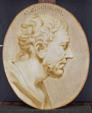 Das Gemälde gehört zu einer Serie von vier Porträtdarstellungen im Hochoval. Dazu gehören die fiktiven Porträts der Philosophen Lucius Annaeus Seneca (1 -65 n. Chr.; Schriftzug "Seneque") und Alkinoos (Schriftzug "Alsinous" ) sowie die Porträts des Kurfürsten Karl Theodor und seiner Ehefrau Elisabeth Auguste, Alle Arbeiten wurden als Grisaillemalerei ausgeführt. Alle Arbeiten imitieren die Form eines gemalten Reliefs. zu Leittenstorffer siebe https://de.wikipedia.org/wiki/Franz_Anton_Leitenstorffer Zu Elisabeth Auguste siehe https://de.wikipedia.org/wiki/Elisabeth_Auguste_von_Pfalz-Sulzbach