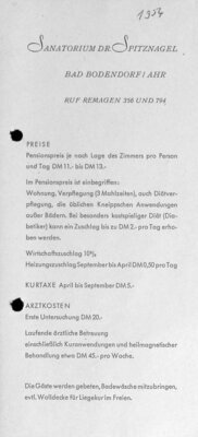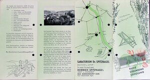 Flyer, vierfach gefaltet und einem einseitig loses eingelegten Preisblatt mit Pensionspreisen, Kosten Kurtaxe, Arzt- und Behandlungskosten. Der Flyer ist bebildert mit mir Außenaufnahmen des Sanatoriums und einem Ortspanorama, vom Reisberg Richtung Landskron aufgenommen, und Beschreibungen der Behandlungsmöglichkeiten sowie einer Anfahrskizze mit Beschreibung.