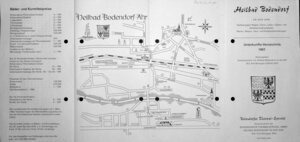 Achtseitiger Flyer um Graudruck. Auf der aufgeklappten Vorderseite sind die Krankheiten aufgezählt, die mit dem Heilwasser behandelt werden können, sowie die Preise für Heilmittel und Schwimmbadbesuch. In Mittelteil ist Karte des Ortes mit eingekreisten Nummerm der Unterkünfte und Heilbehandlungsmöglichkeiten. Im Innenteil sind die Unterkünfte und Heilbehandlungsmöglichkeiten nummeriert. Die Flyer wurden durch die Bodendorfer Thermalsprudel GmbH versendet.