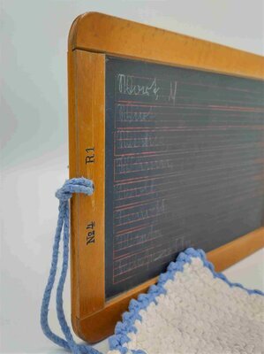 Die Schiefertafel besteht aus einer Schieferplatte, die von einem Holzrahmen eingefasst ist. In die Schiefertafel ist auf der einen Seite ein kariertes Muster und auf der anderen Seite Linien eingeritzt, so dass auf der einen Seite die Matheaufgaben und auf der anderen Seite die übrigen Aufgaben in der Schule bearbeitet werden konnten. Bei den Linien handelt es sich jedoch nicht um einfache Linien, sondern um die Art von Linierung, wie man sie heute auf Kieserblöcken findet, die in der ersten und zweiten Klasse verwendet werden. Am Holzrahmen ist ein gehäkeltes, weiß-blaues Läppchen aus Baumwolle befestigt, in welchem zu diesem Zweck ein kleines Loch gebohrt ist. Des Weiteren ist der Rahmen zusammengesteckt und geleimt und er besitzt eine Prägung: Auf der Seite mit den Linien ist N°4 links und R1 rechts des Loches für das Läppchen eingeprägt. Es ist jedoch keine Prägung vorhanden, die Aufschluss über den Hersteller gibt. Die Schiefertafel ist noch mit Schreibübungen und Matheaufgaben aus dem Jahr 1936 beschrieben. Die ehemalige Besitzerin der Tafel war damals in der ersten Klasse.
