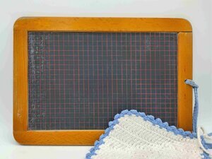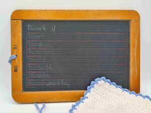 Die Schiefertafel besteht aus einer Schieferplatte, die von einem Holzrahmen eingefasst ist. In die Schiefertafel ist auf der einen Seite ein kariertes Muster und auf der anderen Seite Linien eingeritzt, so dass auf der einen Seite die Matheaufgaben und auf der anderen Seite die übrigen Aufgaben in der Schule bearbeitet werden konnten. Bei den Linien handelt es sich jedoch nicht um einfache Linien, sondern um die Art von Linierung, wie man sie heute auf Kieserblöcken findet, die in der ersten und zweiten Klasse verwendet werden. Am Holzrahmen ist ein gehäkeltes, weiß-blaues Läppchen aus Baumwolle befestigt, in welchem zu diesem Zweck ein kleines Loch gebohrt ist. Des Weiteren ist der Rahmen zusammengesteckt und geleimt und er besitzt eine Prägung: Auf der Seite mit den Linien ist N°4 links und R1 rechts des Loches für das Läppchen eingeprägt. Es ist jedoch keine Prägung vorhanden, die Aufschluss über den Hersteller gibt. Die Schiefertafel ist noch mit Schreibübungen und Matheaufgaben aus dem Jahr 1936 beschrieben. Die ehemalige Besitzerin der Tafel war damals in der ersten Klasse.