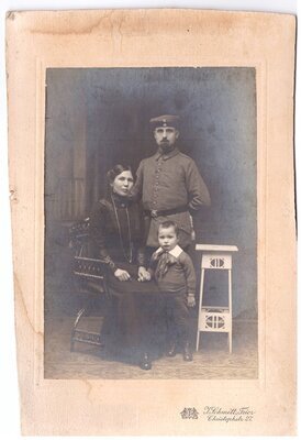 Zu sehen ist ein Soldat der Landwehr in feldgrauer Uniform. Am Kragen ist die Nummer 40 zu erkennen. Die Landwehr ist ein milizartiger Verband, der später einem stehenden Heer zugeordnet wurde. Das Modell der Uniform ist aus dem Jahre 1910, die Aufnahme entstand jedoch nach 1914. Auf der Rückseite befindet sich Werbung des Fotoateliers.