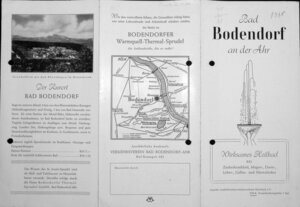 Sechsseitigen Prospekt Dier Vorderseite ziert ein von händengetragener Schale mit sprudelndem Brunnen. Auf den folgenden Seiten erfolgt die Vorstellung des Ortes und die Wegbeschreibung. Der Flyer war für eine Schutzgebühr von 5 Rpf. zu kaufen.