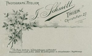 Brustportrait einer Jungen Dame mit hoch frisiertem Haar in dunklem Oberteil, das mit dunklen floralen Arabesken appliziert ist. Sie schaut links aus dem Bild. Unter dem Bild, auf grauem Karton: J. Schmitt Trier Christofstr.