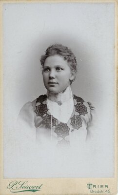 Brustportrait einer jungen Dame mit hoch frisiertem Haar. Sie trägt ein helles Oberteil mit einem noch hellerem Kragen und Brusteinsatz, der von einem Kranz großformatiger Dahlien ähnlichen Blumen umgeben ist. Am Ohr hängt Schmuck. Vielleicht ein Stein. Sie trägt eine lange Perlenkette. Unter Dem Bild: P. Seiwert Trier Brodstr. 45 Rückseite: In Jugendstilschrift und mit Seerosen: Atelier P.Seiwert Brodstr. 45 Platinbilder u. Photocrayons Künstl. Ausführung-Oel u. Pastellmalerei. Spezialität: Vergrösserung nach jedem Bilde in künstlerischer Ausführung bis Lebensgrösse. Die Platte bleibt für Nachbestellungen aufbewahrt.