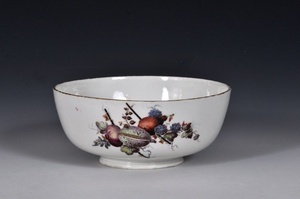 Teile eines Kaffeservice, dekoriert mit bunten Früchten und Gemüsestilleben