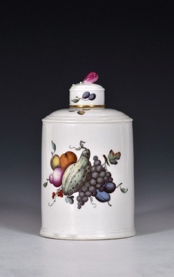 Teile eines Kaffeservice. Maße: Teedose, Höhe: 13,5 cm Kumme, Durchm.: 14,8 cm Tasse, Höhe: je 6,6 cm, Durchm.: je 12,9 cm Bezeichnung unter dem Boden: Kurhutmarke