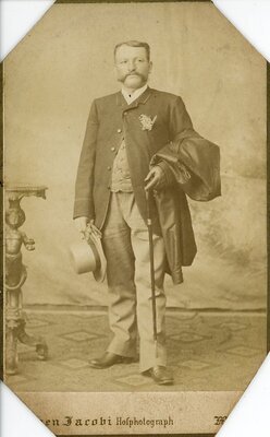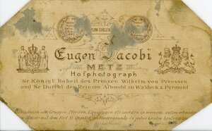 Abbildung eines stehenden Herren mit kurzen Haaren und einem Oberlippenbart, der als Backenbart endet. Er trägt helle Hosen, - und Weste und einem dunkleren Gehrock mit einem weißen Sträußchen auf der Brusttasche. Am Hals sieht man einen weißen Hemdkragen. Er steht entspannt, frontal zur Kamera und blickt rechts am Betrachter vorbei. Mit der rechten Hand hält er Handschuhe und einen hellen Hut mit dunklem Hutband; über dem linken Unterarm liegt ein leichter Mantel und mit der linken Hand hält er einen Spazierstock. Unter dem Bild:...en Jacobi Hofphotograph M Rückseite: Eugen Jacobi METZ Hofphotograph Sr. Königl. Hoheit des Prinzen Wilhelm von Preussen Sr. Durl. Des Prinzen Albrecht zu Waldeck & Pyrmont