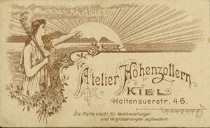 Brustbild eines jungen Herren in Marineuniform. Er schaut direkt, mit leichtem Silberblick in die Kamera. Auf der Oberlippe Andeutung eines flaumigen Bartes. Seine Jacke hat metallische größere Knöpfe und Schulterklappen. Sein Kragen zeigt eine Doppel-Litze, auf dem Kopf eine helle Schirmmütze. Unter dem Schirm: ein weißes Band. Unter dem Bild: Atelier Hohenzollern Kiel Holtenauerstr. 46 Rückseite: Eine weibliche Figur, antik gekleidet, eine Fackel tragend zeigt auf eine strahlende Sonne am Horizont.: Atelier Hohenzollern Kiel Holtenauerstr. 46