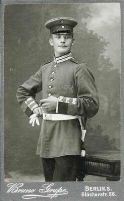 Stehender junger Offizier, vom Kopf bis zu den Oberschenkeln im Bilde, vor einem Tisch in aufrechter, „kecker“ Haltung, den Blick etwas von oben herab In dreiviertel Haltung steht der Körper, nur seinen Kopf hält er frontal ins Bild, sein Blick weist sogar nach rechts. Den rechten Arm hat er, in der Hand weiße Handschuhe, an seinen hellen Gürtel gestemmt; den linken Arm hält er angewinkelt vor den Bauch, in der Hand ein kurzer Zigarrenstummel. Am Gürtel hängt ein Degen, der Kragen hat auf dunklem Untergrund 2 breite parallele Streifen. Im Hintergrund Studionatur. Unter dem Bild Bruno Grupe Berlin. S. Blücherstr. 56 Rückseite: Bruno Grupe Photograph Berlin. S. Blücherstr. 56 Auch Aufnahmen bei elektrischem Licht.