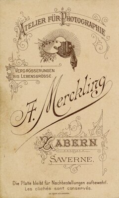 Brustbild eines Offiziers, im Uniformrock ohne Mütze. Beinah Frontalportrait, er schaut knapp rechts am Betrachter vorbei. Die links gescheitelten Haare sind zur Seite und nach hinten gekämmt. Ein nach oben gezwirbeltes Oberlippenbärtchen verziert das Gesicht mit hohen Wangen und sehr hellen Augen. Unter dem Bild: Gg. Hollingshaus Coblenz Clemensstr. 15 Die Rückseite ist unbedruckt sepiafarben.