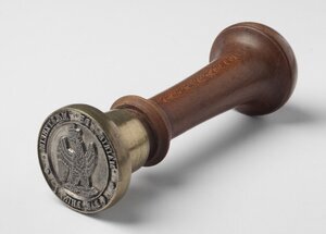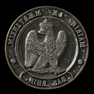 Amtliches Siegel der Bürgermeisterei ("Mairie") Maertzheim (Mörzheim, heute ein Stadtteil von Landau in Rheinland-Pfalz) mit ovaler Siegelplatte und gedrechseltem Holzgriff mit pilzförmigem Knauf. Das Stempelsiegel zeigt den napoleonischen Adler mit Krone und Blitzbündel. Während der Französischen Revolution, im Jahr 1793, stellte die Gemeinde den Antrag, in die junge Französische Republik aufgenommen zu werden. Zunächst gehörte sie zum Kanton Billigheim, dann zum Kanton Bergzabern. Beide waren Teil des Arrondissements Wissembourg im Département Bas-Rhin. Das Département, das im Wesentlichen den nördlichen Teil des Elsass umfasste, war bereits 1790 gegründet worden. Die Ikonographie amtlicher Siegel in diesen Verwaltungsgebieten weist häufig sehr deutlich auf die Zugehörigkeit zum französischen Staatsgebiet hin. [Johanna Kätzel]