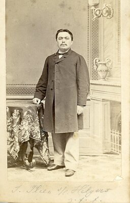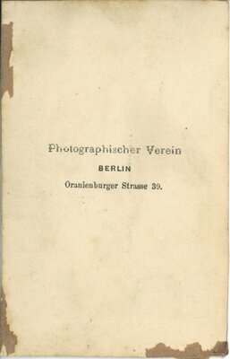 Bildnis eines Herren, in dunklem knielangen Mantel und hellen Hosen. Er steht vor einem Kamin und neben einem runden Tisch mit langer Tischdecke. Seine dunklen welligen Haare sind nach hinten gekämmt. Er hat einen leichten Oberlippenbart. Seinen linke Hand ruht auf dem Tisch. Unter dem Bild mit Bleistift: J. unleserlich j/L Hilgers Rückseitig: Photographischer Verein Berlin Oranienburgerstr. 39