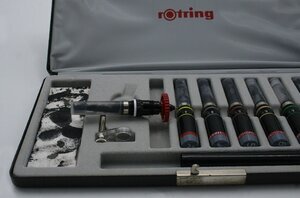 Rotring Varioscript Zeichen-Set aus den 70er Jahren. Inhalt 8 Zeichenkegel verschiedener Strichstärken. Zum Reinigen kann der Tuscheeinsatz aufgeschraubt werden. Dazu wird das Zubehör, der rote Ring, verwendet. Mit ihm lässt sich am Tuscheeinsatz die Spitze zum säubern herausschrauben. Beim Arbeiten mit Schriftschablonen kann man sich die Arbeit erleichtern, indem man das beigefügte Gelenkstück benutzt.