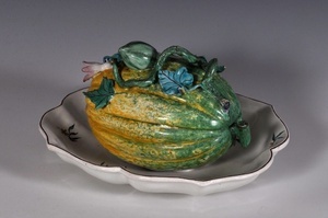 Deckeldose in Form einer Melone mit Unterschale, als Deckelgriff fungiert der geschwungene und grün staffierte Melonenstengel. Die Unterschale ist fest mit der Frucht verbunden und bildet ein einziges Geschirrteil. Höchster Porzellanmanufaktur um 1750 Bezeichnung unter dem Boden: purpurne Radmarke