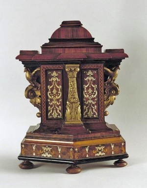 Der kleine Sockel hat die Form einer Gebäudearchitektur mit zwei seitlichen Konsolen, die von vergoldeten Greifvögeln getragen werden. In dem Schlitz im Oberteil war das Kruzifix eingesteckt. Das kleine Möbel diente vermutlich als Hausaltar und vielleicht auch als Reliqienbehälter. An der Rückseite ist ein kleiner Zettel aufgeklebt, auf dem steht: "„Anno 1728, im Mertz bin ich gemacht durch Ludwig Rohde, Churfürstl. MaintzC Hofschreiner Mstr.“" Daher weiß man in diesem Fall genau, wann und von wem dieses Möbel hergestellt worden ist.
