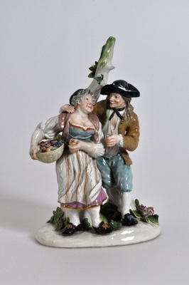 Der Modelleur dieser Bauernfigur ist Carl Vogelmann (Geburts- und Sterbejahr unbekannt) . Er war wandernder Arkanist und Keramiker und war von 1750 bis um 1753 in Höchst tätig. Danach war er 1759-61 in Frankenthal, 1761-66 in Kelsterbach, 1777-78 in Höchst, 1778-79 Steingutfabrik Dirnstein, 1779 Fayencemanufaktur Crailsheim und zuletzt 1781-84 an der Fayencemanufaktur Durlach tätig. Der Porzellanmaler ist an dieser Figur leicht zu bestimmen, denn sie ist unter dem Sockel mit "IZ" bezeichnet. IZ ist die bekannte Signatur für Johannes Zeschinger. Er wurde 1723 in Höchst geboren und wurde schon in früher Jugend in Höchst zum Buntmaler ausgebildet. 1753 ging er nach Fürstenberg, wurde dort 1762 als Porzellanmaler Mitglied der Malerakademie und blieb bis zu seinem Tod in Fürstenberg. Bezeichnung unter dem Boden: purpurne Signatur "I Z"