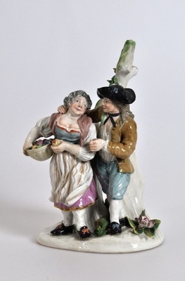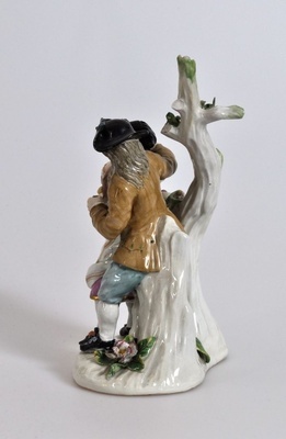 Der Modelleur dieser Bauernfigur ist Carl Vogelmann (Geburts- und Sterbejahr unbekannt) . Er war wandernder Arkanist und Keramiker und war von 1750 bis um 1753 in Höchst tätig. Danach war er 1759-61 in Frankenthal, 1761-66 in Kelsterbach, 1777-78 in Höchst, 1778-79 Steingutfabrik Dirnstein, 1779 Fayencemanufaktur Crailsheim und zuletzt 1781-84 an der Fayencemanufaktur Durlach tätig. Der Porzellanmaler ist an dieser Figur leicht zu bestimmen, denn sie ist unter dem Sockel mit "IZ" bezeichnet. IZ ist die bekannte Signatur für Johannes Zeschinger. Er wurde 1723 in Höchst geboren und wurde schon in früher Jugend in Höchst zum Buntmaler ausgebildet. 1753 ging er nach Fürstenberg, wurde dort 1762 als Porzellanmaler Mitglied der Malerakademie und blieb bis zu seinem Tod in Fürstenberg. Bezeichnung unter dem Boden: purpurne Signatur "I Z"