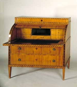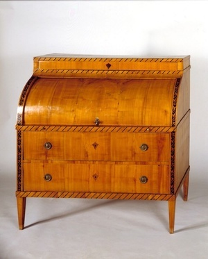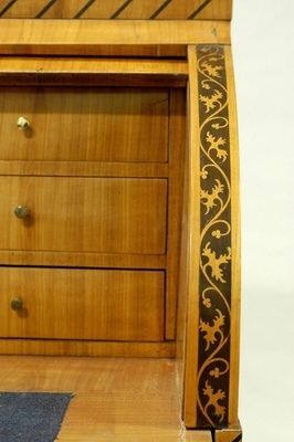 Das Möbel steht auf hohen konischen Beinen. Darüber befinden sich zwei Schubfächer, das Schreibteil und darüber eine weitere schmale Schublade. Das Schreibmöbel besitzt eine walzenförmig geschwungene Abdeckung der Schreibfläche. Von dieser Zylinderform leitet sich der Name dieses Schreibmöbeltyps ab, es wird "Zylinderbureau" oder auch "Rollbureau" genannt. Geöffnet wird die Schreibklappe, indem man sie der Zylinderform folgend, in das Möbel "hineinrollt". Danach kann die Schreibplatte an den beiden Metallknäufen herausgezogen werden. Die Inneneinrichtung des Schreibteils ist einfach gehalten. Aus praktischen Gründen ist die Schreibplatte mit Leder überzogen, die anschließende Rückseite besteht aus einem mittleren offen Fach, um das sich kleine Schubladen reihen.